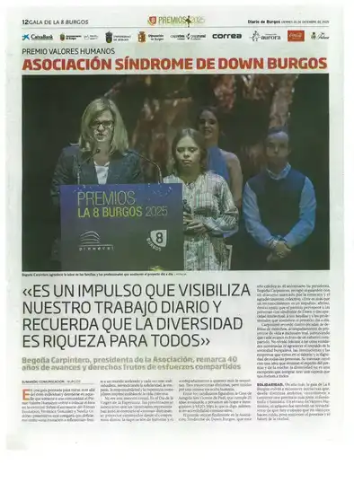 Consumidas las 3/4 partes de la Gala en la que la 8 Burgos entregaba sus premios 2025, Verónica periodista de la 8 abrió el sobre anunciando que Down Burgos se alzaba con tan prestigioso galardón. Se hizo esperar pero valió la pena, al fin la estatuilla con la que se identifica el grupo Promecal reposará en las vitrinas de la asociación burgalesa.